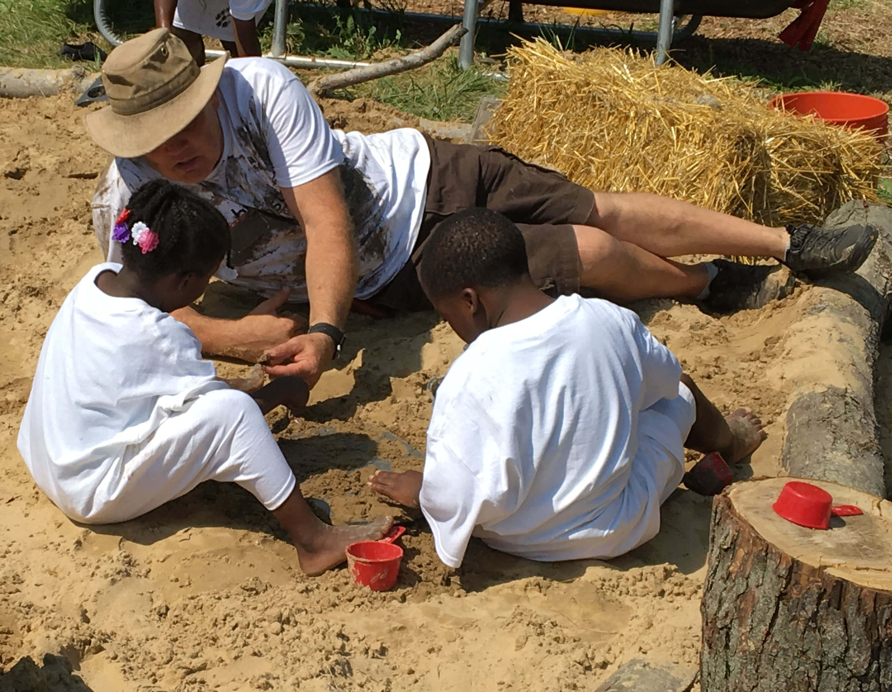 To engage children in play, our team introduced loose parts to the installation, such as sand and dirt for digging.